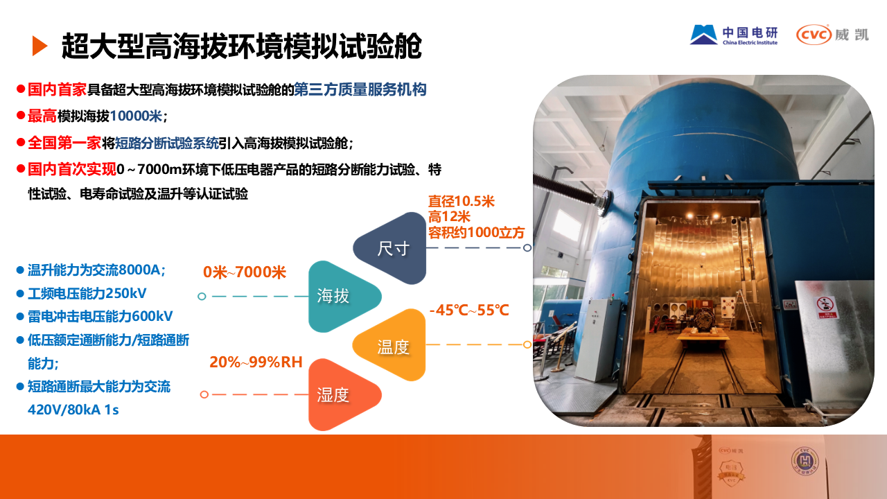 昆明高海拔電器檢測有限公司,隸屬于中國電研威凱公司,是國家高原電器產品質量檢驗檢測中心、機械工業高原電器產品質量監督檢測中心,是我國電工產品高原環境技術研究歸口單位和高原電工產品國家標準制定單位。公司以高原環境適應性與可靠性技術研究為基礎,深度服務國家能源、交通等發展戰略,構建覆蓋“發、輸、變、配、儲、用”全產業鏈的高原環境可靠性研究服務與質量技術綜合解決方案。重點為新型電力系統、智慧電網、直流微電網及新能源領域、軌道交通領域、水力發電領域等的建設、運營與維護提供專業技術支撐,確保電力設備、能源裝備的質量與可靠性。同時,面向低空經濟(無人機等)、具身智能、智能家電、醫療器械等各類工商業電子電器產品,提供專業的高原環境適應性研發、測試與認證服務,推動各行業產品的高原應用創新與質量提升。作為國內首家擁有超大型高海拔環境模擬試驗艙的第三方機構,我們具備10000米海拔模擬能力,全國首家實現0~7000米海拔下低壓電器的短路分斷、電壽命、溫升等關鍵試驗,以領先的硬件實力持續賦能中國制造的高原應用與可靠性發展。